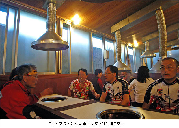 남은길은 계속되는 딴힐이다. 아까 며느리고개 정상까지 왼쪽의 그윽한 가을 산림의 장관을 끼고 시원하게 달린다. 금새 종착지로 와버렸다. 남전상무님의 배려로 오늘은 로드중간에 지나온 화로구이집으로 알샵이스타나로 이동하여 점심겸 저녁을 먹었다.
