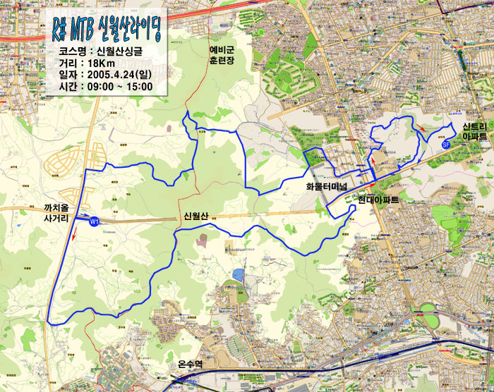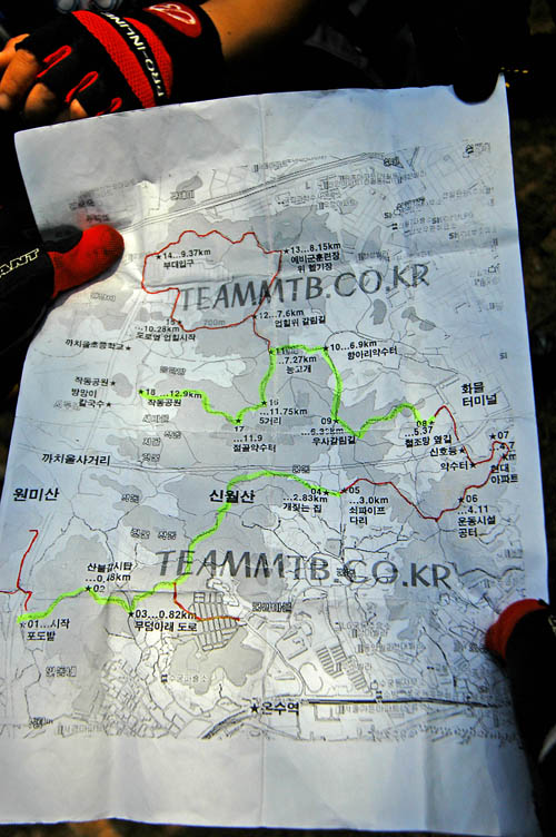 신월산을 주로 타는 teammtb동호회에서 상세한 신월산지도를 구할 수 있다고 한다. 이박사님이 가지고오신 신월산 라이딩맵.. 매우 상세하게 만드셨다. 만드신분의 열정이 배어있다. 하지만 정작 지도는 크게 참조할 필요가 없었다. 이종화박사님이 부천에 사시는 지라 자주 이곳을 라이딩하신다고 한다. 길을 거의 외우고 계신다.^^