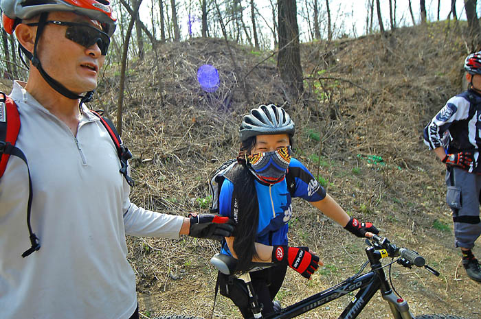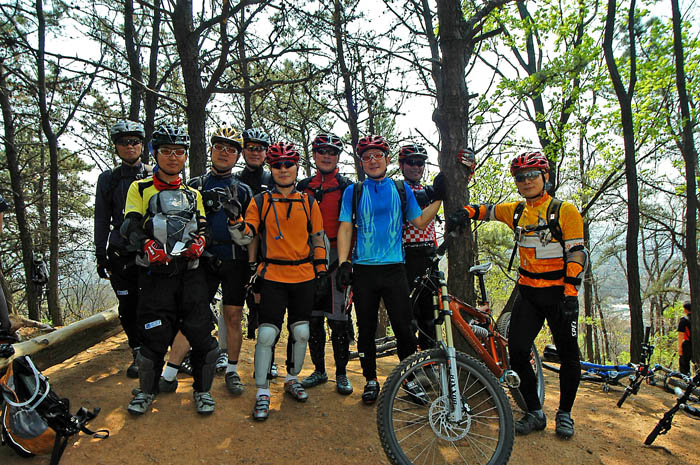 예비군 훈련장쪽 순환을 한번 하고 가자는 이박사님의 의견에 모두 흔쾌히 아래로 내려서는데 쭉쭉 등산로를 따라 딴힐을 하다 트위스트 계단앞에서 더이상 진행할 수 없었다. 짧았지만 잘못하면 날라가 꽂힐 것 같은 공포감을 준다. 포기를 하고 잔차를 등에 매려는 데 김소장님이 이어 따라온다. 딱 자세를 잡으시더닌 두두두.. 한방에 그길을 내려가시는게 아닌가.. 아.. 속죽어..ㅠㅠ 에잇.. 나도 참을 수 없다. 시도는 해보자라는 각오로 싯포스트까지 내리고 이를 악물고 1차시도.. 앗 중심을 잃었다.. 스톱.. 김소장님이 아래에서 코치해 주신다. 다시 좀더 멀리서 출발하란다. 다시 좀더 뒤로가서 클릿을 끼우고 출발.. 웨이백을 심하게 했는데.. 엇.. 바퀴가 밀린다.. 브레이크를 풀고 나무계단을 그냥 내려간다. 결국 성공이다.. ^^ 깡을 키워주신 김소장님께 감사드린다.
