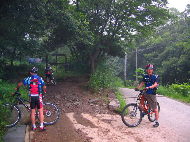 사실 우린 강남300을 생각하고 로드로 갈 생각이었는데 엉뚱하게 할머니보리밥집 근처로 진입해 버린 것이다. 길은 넑직하고 잘 닦여져 있었다. 임도와 등산로의 중간쯤의 형태를 띄고 있었다. 역시 수풀을 울창했고 전반적으로 기분좋은 딴힐코스였다. 나중에 알고보니 이길이 바로 오디랠리코스중에 보리밥집가는 길이었다. 마지막 딴힐부분은 경사가 가파르지만 재미도 있었다. 거기서 다시 맹산전원주택단지 쪽으로 방향을 잡는다. 로드 업힐을 꾸준히 하다보면 새나리고개에서 맹산전원주택단지를 지나 새마을고개능선까지 오른다.