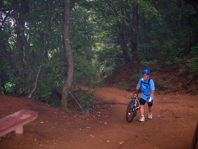 이어 나무계단이 웹이브져서 나타난다. 높이가 낮고 비교적 좁은 계단이라 시도해 본다. 성공.. 이전에도 무난하게 내려온 곳이다. 급수탑앞에서 쉬면서 단월낭자에게 비상소독약도 제공하고 한숨들을 돌려본다. 야호능선을 찾아 내려가야 한다. 일행을 이끌고 이전 오디랠리때 연습한 야호능선 초입안내를 해준다. 야호능선은 자잘한 등산로가 잘 조합된 재미난 싱글코스다. 숲길의 정취를 한껏머금은 등산소로를 따라 오르락 내리락을 하다보면 저절로 기분도 좋아진다. 때로는 숨이 가쁘게 올라야 하는 코스도 있지만 짧은지라 체력을 완전히 소진시키지는 않는다. 오늘 처음나온 성주현님이 내내 선두에서 뒤쳐지지 않고 씩씩하게 잘도 오르락내리락한다. 잔차질에 왠만큼 이력이 있는 자세다. 첨탄사람이 이런 싱글길을 자연스럽게 타기는 어려운데.. 체력도 좋아 보인다.