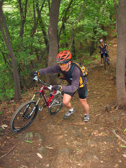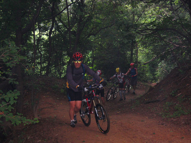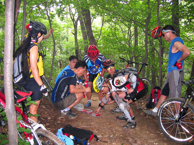 다시 싱글길을 호기심을 가지고 오르다 보니 날카로은 바위덩어리길이 버티고 있다. 전날의 비로 인해 땅은 다소 젖어있고 바위 또한 예외는 아니어서 타이어가 헛돌고 만다. 예상했던터라 바로 끌바로 돌입한다. 싱글의 묘미는 끌바와 질바가 조합될 수 있다는 것이다. 물론 처음 접하는 사람에게는 곤혹스러운 길일 것이다. 잔차없이 걸어가도 힘들길을 잔차를 끌고 또는 지고 간다는 것이 말이 되겠는가? 하지만 그것이 싱글의 묘미라고 생각한다. 그에 따른 심장의 호흡의 압박후에 잠시 쉬어가는 기쁨이 있기 때문일 것이다. 싱글은 지속적으로 계속 라이딩은 사실 어렵다. 물론 체력이 좋으신분들이라면 잠시도 쉬지 않고 갈 수는 있겠으나 왠만한 고수가 아니라면 고비마다 기술과 체력을 쏫아붇고 잠시쉬고를 반복하며 오르리라 생각된다. 레이싱하러 나온터가 아니라 우리도 예외는 아니다. 급한 고비를 넘어서면 다시 잠시쉬고 또 오르다 고비를 넘고 쉬고 이런식으로 오늘의 라이딩은 계속된다. 오늘 처음 나오신 성주현님은 산악잔차 입문을 싱글로 하는 고통을 맛보고 계신다.