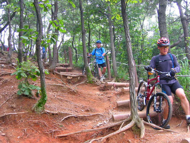 난 말을 아끼기로 했다. 자꾸 말하면 맞을 수도 있다는 것을 터득했던지라..^^ 묵묵히 앞에서 길만 안내한다. 예전에 타잔능선을 넘어갈때는 아주 쉽게 넘어 다닌 기억이 있었는데 오늘따라 왜이리 오르막이 많은지.. 알다가도 모를일이다. 체력이 따운되었나 보다. 오른쪽에 철조망을 끼고 숫돌봉까지 열심히 오른후 오늘의 마지막 탈출구를 향해 딴힐을 시작한다. 내가 생각해도 삭막한 속도로 딴힐길을 잡아본다. 점핑을 시도해 보는데 왠만한 나무 그루터기는 점프해서 넘어본다. 겁을 상실하는 순간이다. 급경사도 만만해 보인다. 노면이 미끄러워 슬립하기 보다 점프하는 것이 더 낳다는 무모한 생각을 했던 탓일까.. 정신없이 마구내려가다 보니.. 삼연속 통나무 계단이 넓은 간격으로 급경사에 떡 버티고 있다. 이미 속도를 늦추는데는 실패 했다. 상당한 속력으로 첫번째 통나무를 점프해서 넘는다.. 퓽!!.. 그런데.. 너무 높이 솟았다.. 두번째 통나무에서 한번더 점프후 완전히 새가 되는 순간이다. 세번째 통나무는 뭐.. 앞바퀴부터 걸려서 몸따로 날라간다..^^ 이전 유포리 자빠링이 재현되는 순간이다. 헬멧부터 하체까지 순차적으로 뭉게진다. 다행히 흙이 있는 곳에 넘어져 팔하고 다리고 긁히기만 한다. 타박상도 없다.. 운이 좋았다. 오버 딴힐의 마침표였다. 다음 이어지는 통나무는 조심조심 천천히 기어서 내려간다.