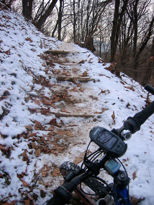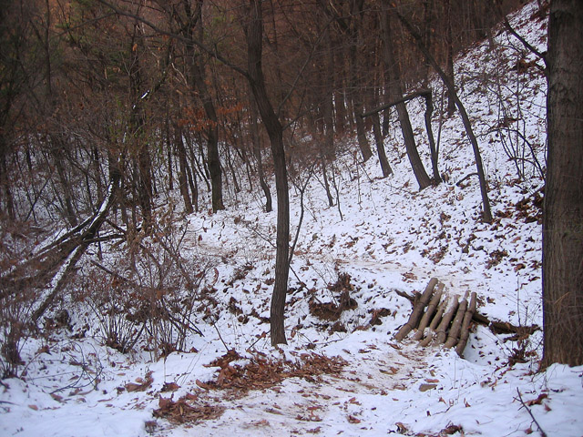 국사봉쪽으로 오르고 싶었지만 내겐 시간이 많지 않은지라 인덕원쪽으로 내려가기로 한다. 조심스럽게 싱글 눈길을 내려서보니 타이어 그립이 만족스럽다. 일반 흙길과 그다지 크게 다르지 않다. 엇저녁 타이어 바람을 많이 빼놓은 덕인지 눈밭 업힐에서도 밀리지 않는다. 내려가는 라이딩이 굉장히 즐거워지고 있다. 묻지마 업힐에 대한 보상이 주어지고 있었다.