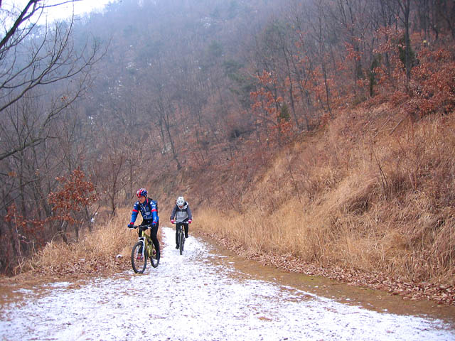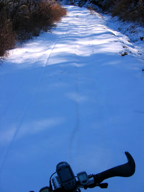 드디어 도토리 코스에 접어드니 새로운 신천지가 펼쳐져 있었다. 최근들어 계속된 신설에 아무도 지나간 흔적이 없는 환상적인 눈밭임도가 제앞에 펼쳐져 있었다. 대략 10센티여의 깊이를 자랑하고 있는 눈밭을 저단으로 꾸역꾸역 오르고 있자니 그 재미가 쏠쏠했다. 타이어의 그립도 좋고 뽀드득대는 신설의 느낌이 부드럽기까지 하다.