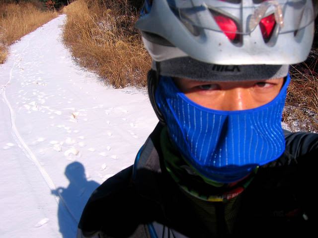 눈밭 딴힐은 타이어의 그립보다는 연속된 슬립으로 내려간다는 표현이 적절할 듯 싶었다. 모글 좋아하시는 김소장님이나 이박사님 오시면 광분하시지 않을까하는 상상마져 든다. 이 모든 즐거움을 나만 느끼기에 아쉬운지라 이 겨울이 가기전에 알샵분들은 도토리 북사면을 꼭 한번 잔차로 타보시길 바란다. 일반 흙임도에서 뒷바퀴나 앞바퀴 슬립이 두려우셨던 분들 부드러운 눈밭에서 원없이 연습해 보시길 또한 바란다. 한 두어시간만 타면 마스터 하실 수 있으리라 확신한다.^^ 셀카되겠다. 본인보다 뒷쪽 지나온 타이어 자욱을 자세히 보기 바란다. 선명하지 않은가?