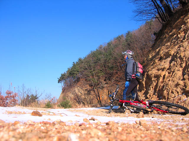 느긋하게 혼자 도토리를 거의 올라갈 즈음에서 마음은 점점 적적해 지기 시작한다. 처음에 이색적으로 재미난 눈들이 이젠 타이어에 쩍쩍 붙어 온다. 소리산 그늘에 쌀쌀한 날씨도 점점 몸과 맘을 초반부터 지치게 하고 있었다. 임도가 거의 눈밭이어서 발디디고 쉴만한 양지도 찾기 어려웠던지라 알샵에서부터 도토리업힐이 거의 끝나갈때까지 쉬지 않고 오르고 있기도 하고.. 그나마 쪽찐 양지마루에서 잠시 쉬어보지만 별로 즐겁지가 않다..