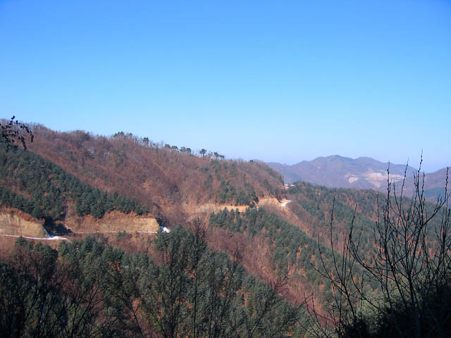 맑고 청명한 날씨인지라 지나온 7부능선 자락이 건너편까지 선명하게 들어온다. 숲에는 없는 눈이 임도에만 쌓여 있는 것이 보이는가?