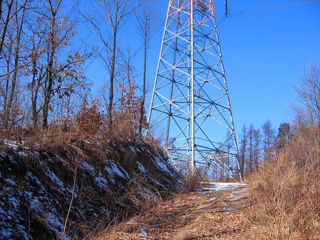 어쩌겠는가? 혼자 나선길인데.. 가다가 송전탑1번 갈림길에 도착하게 된다. 밭배고개쪽으로 가지 않고 송전탑1번 공략에 나선다. 하지만 눈밭길이라 업힐 경사가 급해질 수록 타이어 그립이 좋지 않다. 송전탑 거의다 올라서 결국 눈속에서 헛도는 타이어 때문에 결국 끌바를 하게 된다. 역시 급한 눈밭 업힐에서 끌바는 반갑지 않다..