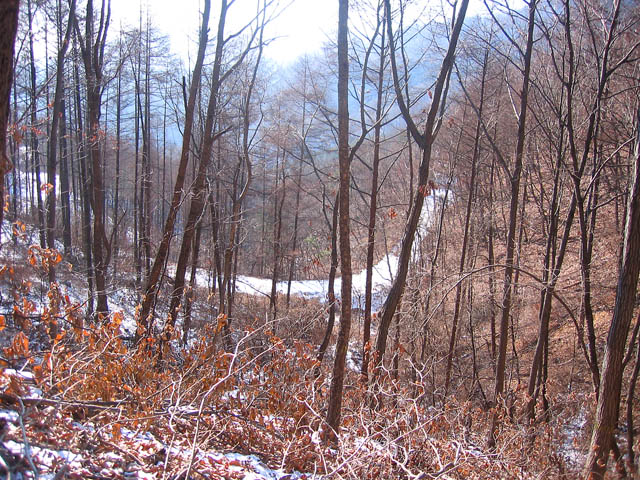 뭐 겨울이라 잔풀도 거의없고 숲속이라 눈도 별로 쌓여 있지 않았다. 하지만 급한경사에 정리되지 않은 나무가지 들은 장애물로 제구실을 제대로 해주었다. GPS를 확인하면서 계곡을 따라 약 4~500미터 정도를 내려오니 멀리 반가운 소리산 남쪽임도가 보인다. 그대로 업힐하면 비솔고개까지 오르게 된다.