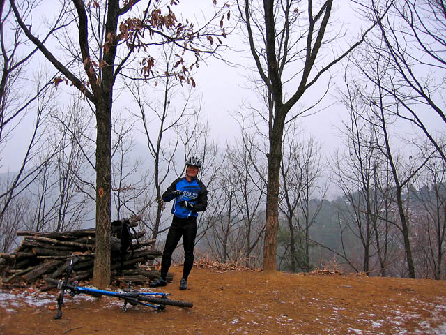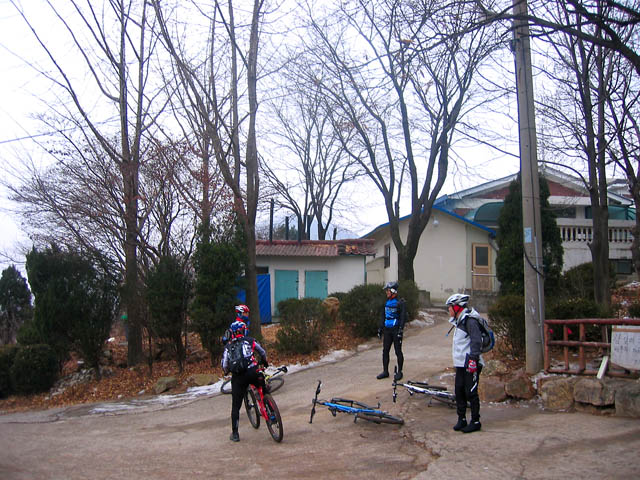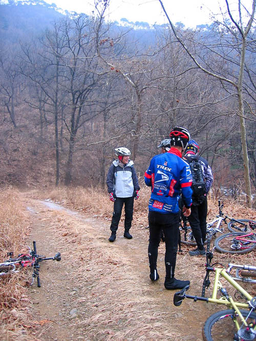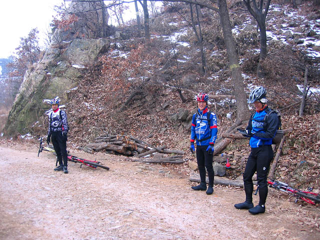 쉬는 횟수를 자주 가지며 오르는 수리산은 말그대로 널널하다. 천천히 느긋하게 봄같은 겨울철 라이딩을 즐기며 B코스를 오르고 있자니 기도원쪽에서 올라온 정선생님이 보인다. 겨울철 내내 절치부심 집에서 롤러타며 오늘 이날을 기다리셨단다.^^ 나하고는 어지간히 인연도 없는지 올겨울에 이러저러한 가슴시린 사정으로 저번 회식이후 처음 뵙는다.^^