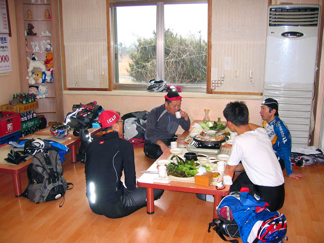 C코스는 식사후 즐기기로 하고 어김없이 오리쌈밥집으로 향한다. 밥시간은 철저히 준수해야 한다는 것이 알샵라이딩의 불문율인지라..^^ 겨울의 한가운데 만난 5명의 열혈 라이더의 감회가 새롭다. 오리쌈밥을 먹으며 정선생님의 건전하고 유용한 건강정보며 트레이닝 비법을 전수받는다.^^ 또한 잔차질와 전립선과의 상관관계에 대해 토론중 깊이 있는 결과도 도출해 본다. 둘끼리는 암 상관없단다.^^