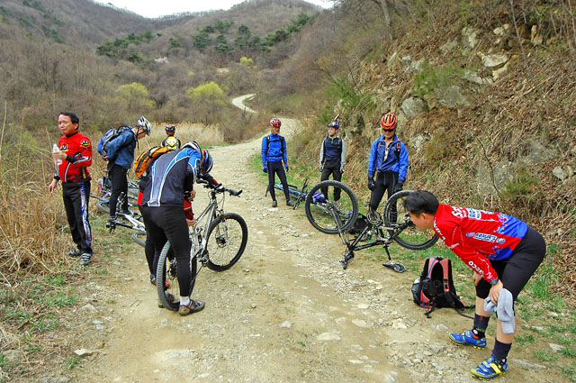 임도 시점인 벌떡 업힐지역앞에서 모두 멀리 코스를 조망하며 쉬고 있다. 남상무님 디스크패드는 패드 뒷쪽 피스톤을 안쪽으로 조금 밀어 넣으니 쉬이 해결되었다. 체인에 가득 달린 찌꺼기 대청소도 해드리고..^^