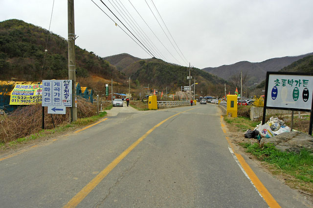 광덕교를 건너기전 초롱박가든 표지판 앞에서 좌회전하여 작은 콘크리트 포장로로 들어서야 한다. 드디어 광덕산 임도가 다시 시작되는 곳이다.