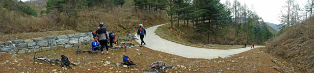 오늘 점심을 먹은 곳이다. 지도상에는 국도로 표시되어 있는 곳인지라 차들의 왕래도 잦다. 차들이 지나가다 펼쳐진 점심자리를 보고 먼지를 피우지 않고 저속주행해 주는 매너까지 보인다. 이곳부터 오늘의 싱글길은 시작되었다. 고개를 넘어 내려가지 않고 우측 거의 140도 턴하여 방향표시가 있는 곳으로 올라야 한다.