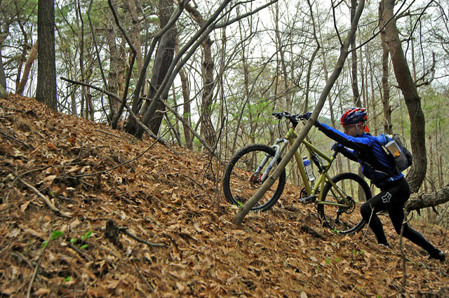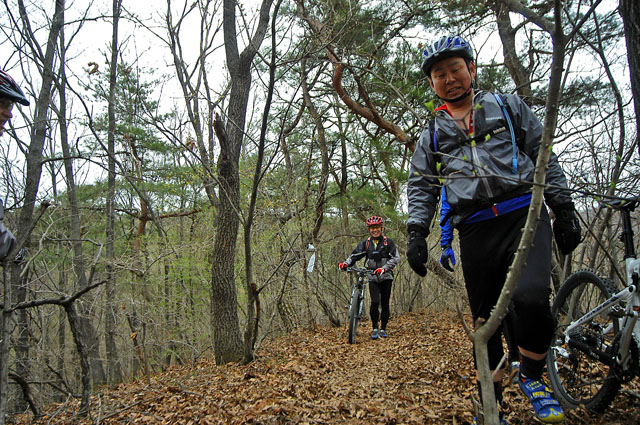 역시 싱글은 싱글이다. 급하고 미끄런 길도 벌떡선 끌바지역도 어김없이 나타난다. 널널 라이딩을 하던 임도전사분들이 끌바에 멜바를 해야 함에 심히 당황하는 기색이 역력하다. 하지만 지나가야 할 곳인지라 포기할 순 없는법. 원하던 않하던 그냥 끌고 메고 가야 한다.