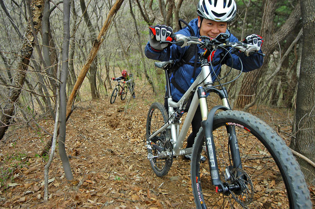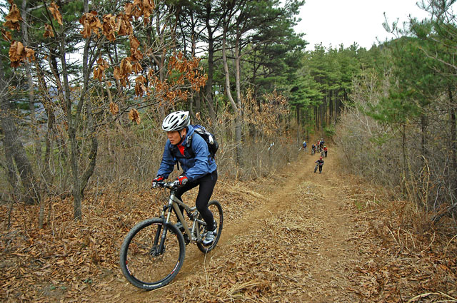 초반은 임도같은 길을 오르다 보면 헬기장이 나타난다. 이곳부터 본격적인 싱글이 시작된다. 잔나무 사이로 수북히 쌓인 낙엽위로 좁은 싱글을 내려간다. 계속 내리막은 아니지만 완만한 경사에 한껏 일행은 고무된다. 싱글의 상태가 아주 좋다는데 모두 이의가 없다. 하지만 곧이어 이것은 너무 빠른 속단이었다는 것을 알게된다.