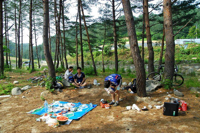 준비해 놓은 아침상이 너무 푸짐했는지 다 비우지 못하고 다시 일어난다.. 4시간전에 먹은 아침 설렁탕이 채 소화되지 않았난 보다. 하지만 해발 1천백여미터의 삿갓재를 넘어가려면 속이 든든해야 됨을 이미 답사때 체득한지라 많이 먹으라고 말씀드린다. 하지만 내맘과 같지 않다. 부지런히 잔차를 끌고 다시 팀원들을 삿갓재로 향한다.