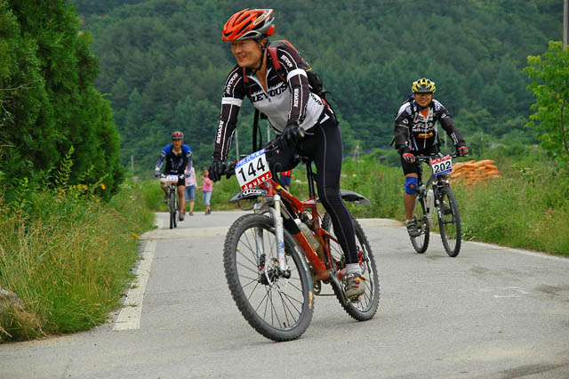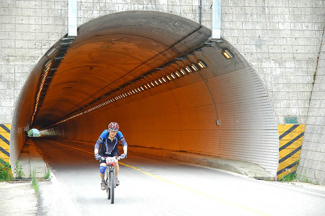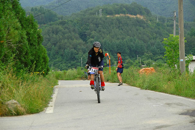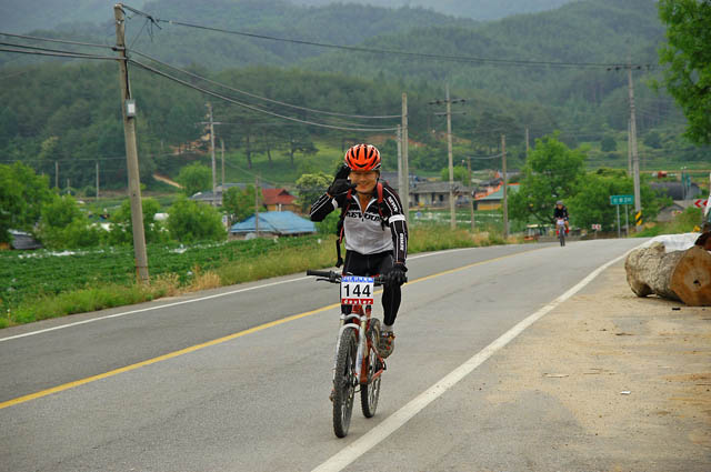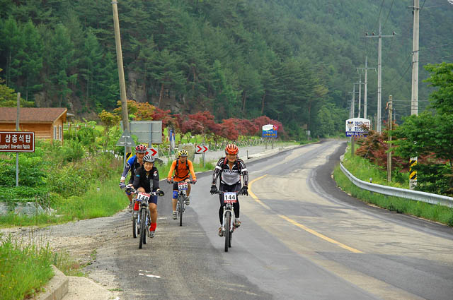 차에 타고 있자니 잔차한대가 눈에 들어온다. 페달링이 힘차 보인다. 다락재를 훌쩍 넘어오고도 힘이 남아도는 페달링이다.. 출발한지 2시간 20여분만이다. 무의식중에 카메라를 꺼내들고 화이팅을 외치며 사진을 찍어보지만 뒷모습만 담게 된다. 지금 생각해보면 완주자중 1,2위분이 아니었을까 하는 생각이 든다.