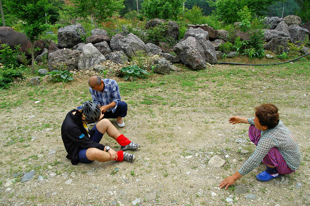 마눌과 함께 영양터널로 향하다가 근처 민가를 발견.. 인심좋은 시골할머니한테 엇저녁 요리를 못하고 남은 돼지 불고기 한봉지를 선사하고 대바늘하나 빌린다. 하지만 대바늘을 준비해 놓고 단월님 손을 따야 하는데 경험이 있는 선수가 없다.. 대략 낭패..ㅠㅠ 하지만 어디선가 젋어 보이는(?) 동네 어르신 한분이 나타나고 기꺼히 자수성가하신 노련한 솜씨로 단월님께 대바늘 신공 사혈을 제공해 주신다. 검은피는 나오지 않지만 어르신의 손동작만으로도 충분히 치료는 되었을 것이다.