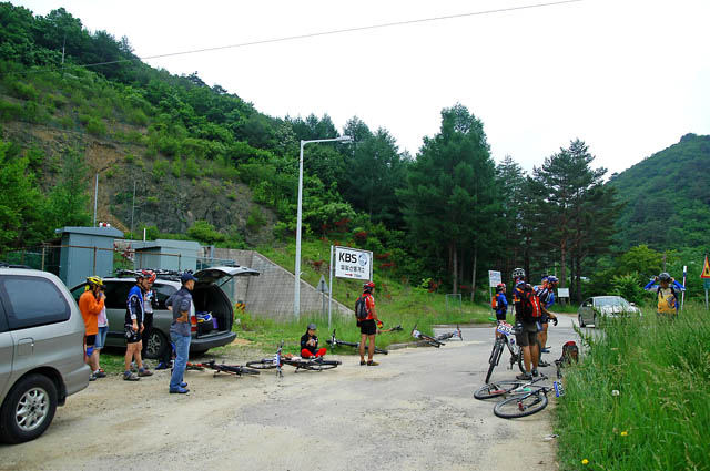 이박사님 잔차는 리어샥 에어가 빠졌다고 한다. 옆에 마찬가지로 쉬고 있는 다른 동호회분들께 샥펌프 빌려서 박사님 잔차를 구원해 준다. 잠시지만 충분히 쉬고 난후 일행은 드디어 로드를 거쳐 박달재로 향한다.