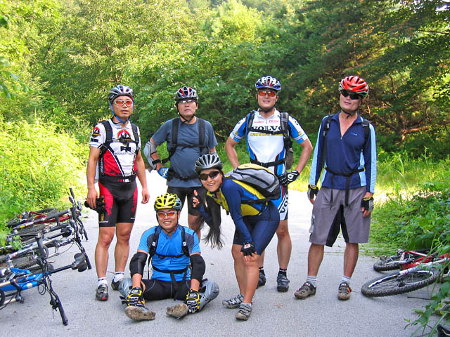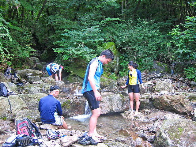 8.5일(토) 아침일찍(04:00)부터 저녁까지(10:00)까지 열심히 보낸 하루였습니다. 거의 졸면서 잔차를 탔다는 느낌이구요.. 여름낮의 뜨거운 열기는 일주일동안 게을리 보낸 나를 용서치 않았습니다. 땀을 비오듯 흘리고 준비해간 물이 바닥나 안타까운 라이딩이었습니다. 하지만 향소리-비솔고개-도토리후반부를 거쳐 히계터골 계곡물에 들어선 순간 모든 피곤함은 싹 가셨습니다. 얼음짱같은 물에 몸을 담그는 순간 열기와 싸워야 했던 라이더분들은 그 고통의 기억을 순식간에 머리에서 지웠졌습니다.