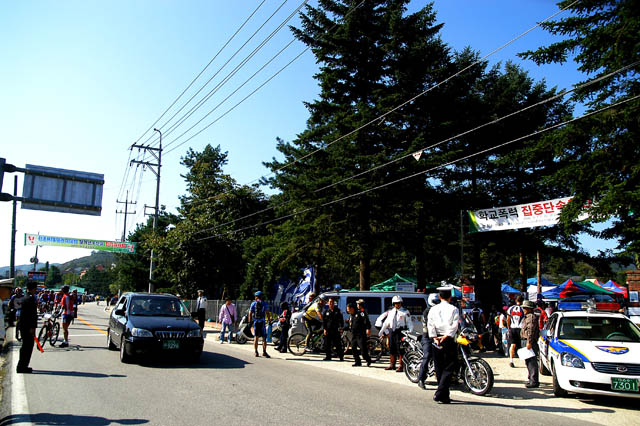 저번 사전답사때 결국 끌바를 한 봉화재 업힐구간에서 과연 상급선수분들은 어떻게 오르는지 궁금증을 떨칠 수가 없었다. 봉화산 입구까지 부지런히 오르고 나니 주최측에서 준비한 급수대가 있었다. 진행요원분이 잔차를 타고서는 더이상 아래로 내려갈 수 없다고 한다. 역주행시 선수들과의 접촉사고가 우려된다고..