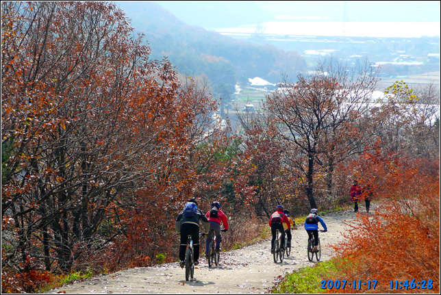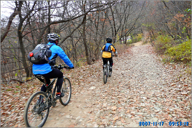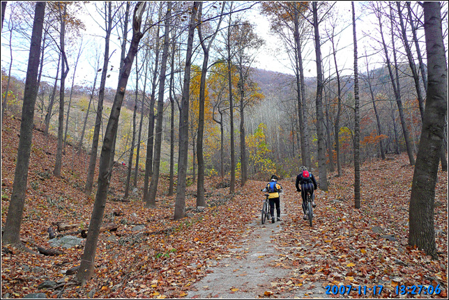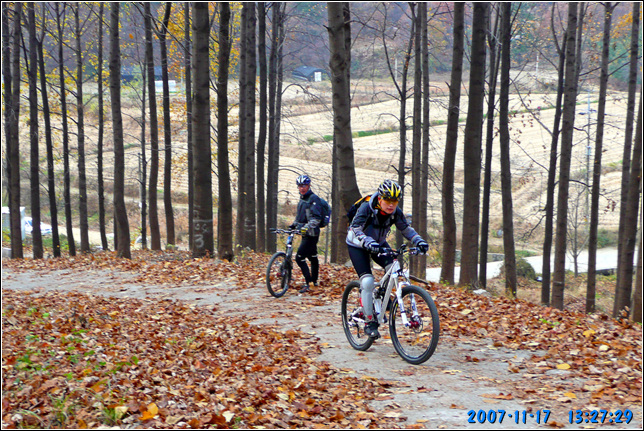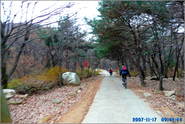 A코스부터 최근에 잘 포장된 임도길 딴힐이 시작된다. 마사토를 잘 다져놓아 노면 상태는 극상이다. 잔자갈 하나 없는 길이 질감마져 좋다. 그런길을 3반장은 풀샥잔차로 기어서 내려간다. 뒤따라 오면서 연신 속도를 좀 내보라고 애원하지만 부동의 자세로 얼어서 내려오는지라 뭐라 더 말하지 못한다. 아무래도 초창기 수리산 자빠링의 기억에서 못벋어 나는 듯 싶다.