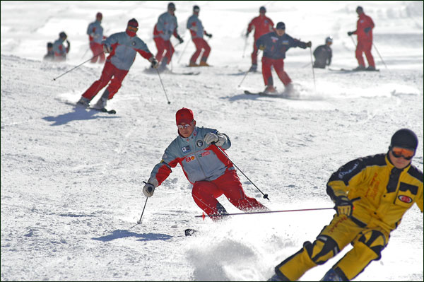 스키 경기 종료후 스키114동호회분들이 떼로 슬로프를 내려왔다. 어찌나 위압적으로 우르르 내려들 오시는지 슬로프 중간에 갖혀 맘이 찔끔했다. 순간적으로 카메라 들어 타탕!! 그중 한장 건졌다.