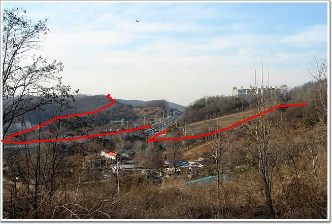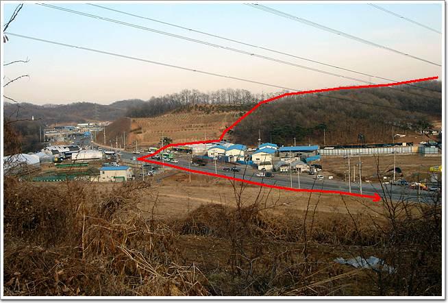 ↓우측 아파트가 보이는 곳부터 고개 건너 일직선으로 이어진 산길이 원정맥길입니다만 자전거로 가기엔 매우 불편합니다. 편한 우회길을 대충 화살표로 나타내보았슴돠. 봉매산 들머리까지 농로로 이어져있슴돠. 도로는 토끼굴로 건너게 되어있구요.