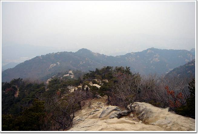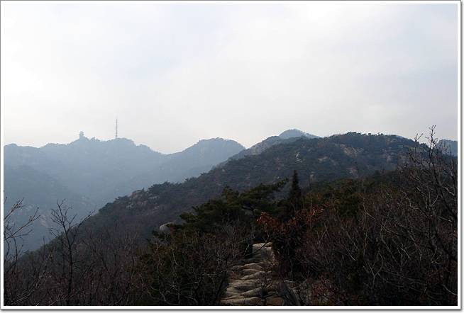 ↓산불감시탑에서 연주대 방향을 보았슴돠. 바로 앞에 보이는 봉우리 두개가 무지 험해 보이지만 실제로 가보니 타고내려올만 하더군요. 그 이후 연주대 밑 헬기장까지 오르는 능선은 끌고 내려와야 할 데가 많았슴돠.