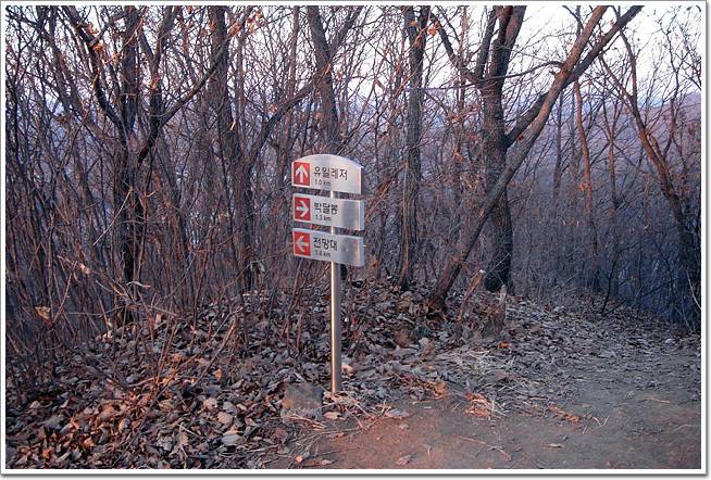 ↓유일레저와 전망대로 갈라지는 지점입니다. 종주코스는 전망대 방향으로 갑니다. 뚜렷한 등산로를 따라가면 되구요, 다소 급한 업다운 구간이 두세개 정도 나옵니다.