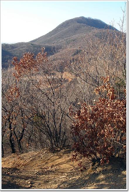 ↓앞에 보이는 산이 박달산 정상 박달봉입니다. 싱글을 내려가면 군부대 철책을 지나 군부대용 포장도로가 나타나는데요, 밑으로 약간 내려가다 우측 임도길을 오르면 작은 운동장만한 헬기장이 나타나고, 임도를 조금 더 오르다 우측 부대울타리를 따라 오르면 박달봉에 도달할 수 있습니다.