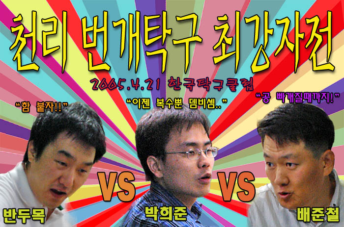 자 망설임 없이 오늘의 피끓는 경기는 시작되었다. 저번에 이어 벼르고 온 박희준 선수의 다부진 모습이 클럽을 긴장시킨다. 다시는 반두목에게 당하지 않으리라는 신념에 찬 각오를 하고 경기에 임했다.