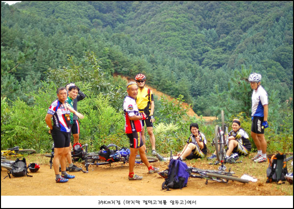 3차코스인 며느리 고개 정상을 향한 라이딩이 시작되었다. 업힐한번과 딴힐 한번후 숨이 껄덕거린다는 껄떡고개(이박사님이 명명하신)가 기다리고 있었다. 2Km가 약간 넘는 업힐인데 막강한 경사도의 위용앞에 결국 마지막 400M에서는 잔챠에서 내려 끌고 올라가야 했다. 라이딩내내 새로산 잔챠가 몸에 맞지 않는지 허리통증이 끊이질 않았다. 마지막 업힐은 그 클라이막스였다. 심장과 다리는 괜찮은데 허리가 끊어질거 같아 걸을 수밖에 없었다. 결국 껄덕거리고 말았던 것이다. 일행과의 수준, 체력차를 절실히 느낄 수밖에 없었다. 부단한 단련만이 해결방법이라 생각하게 해준 라이딩이었다. 일행들이여 저를 버리지 마소서..