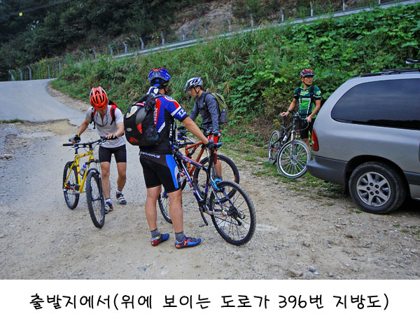 김소장님 일행이 6번국도 대명진입로에서 기다리고 있다고 전화가 왔다. 이사장님 차에 같이 잔차를 싣고 일행을 만나 6번국도를 타고가다 319번(396번이라고도 함)로 갈라져가다 우측 임도 진입로에 차를 주차하고 라이딩 채비를 하였다. 오늘은 중간 경유지인 매곡역에서 중식을 하기로 했었다. 갑자기 장사장님이 두툼한 아이스박스를 꺼낸다. 그 안에는 오늘 점심식단이 고스란히 담겨 있었다. 반찬통, 밥, 반찬거리, 메인디쉬(불고기)까지 총망라 되었는데 아이스박스를 메고 산을 올라갈 순 없는 관계로 각자 한덩어리씩 배낭에 분산시킨다. 나또한 이미 라이딩식량을 여유껏 준비해온터라 무게에 부담을 느껴 눈치보며 반찬통 몇개 배낭에 담았다. 무게가 장난아닌 가장 중요한 요리용 대형 전골냄비는 힘좋으신 장사장님이 직접챙기신다. 헌데 꼼꼼하신 김소장님께서 그만 MTB전용 클립신발을 놓고 오는 엄청난(?)실수를 하셔서 어쩔 수 없이 최길성님의 일반운동화를 빌려신고 일반페달로 라이딩 장도에 오르신다. 김소장님의 끈끈 질퍽한 라이딩을 상상하면 가슴이 아프다.