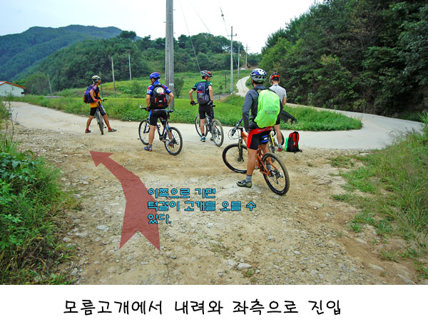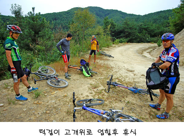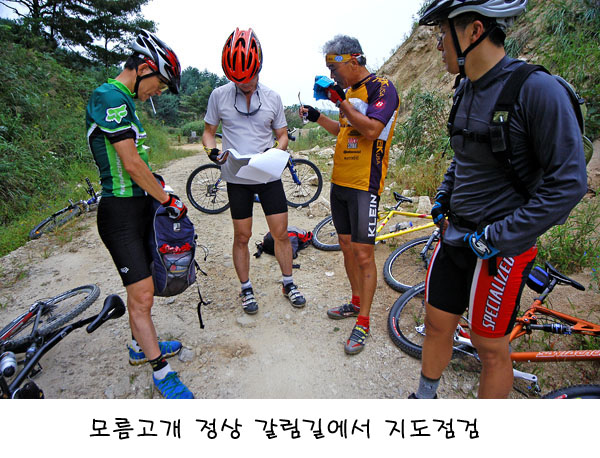 부드러운 임도를 지나고 나면 다시 돌덩어리 업다운힐이 계속 반복되어 마지막 라이딩코스에서도 긴장을 늦출 수 없었다. 특히 자갈길이나 돌무더기 업힐이 오늘따라 유독히 많은 듯하다. 그렇게 2/3을 지나 마지막 모름고개정상에 이른다. 아까 우리가 지나간 임도가 계곡 건너편에 훤히 보인다. 여기부터 처음 출발지까지는 온로드 딴힐만 남았다. 우리의 지치지 않는 변강쇠 라이더 이박사님이 차도 못올라가는 임도가 하나 더 있다고 딴힐도중 그쪽을 돌자고 하신다. 이박사님이 모두의 동의를 구하는 눈치였으나 우리의 일행은 현명했다. 이사장님부터 그냥 딴힐을 내리쏘기 시작한 것이다. 장사장님 나까지 .. 중간에 다른 임도가 있건말건 그냥 마구 쏘신다. 모두가 일심동체였다. 이박사님이 딴힐도중 임도진입로를 가리키며 뭐라고 하시는데.. 일행은 아래만 보며 돌진한다. 모두가 지친하루였나 보다. 시간은 어느덧 오후 3시 30분을 가르키고 있었다.