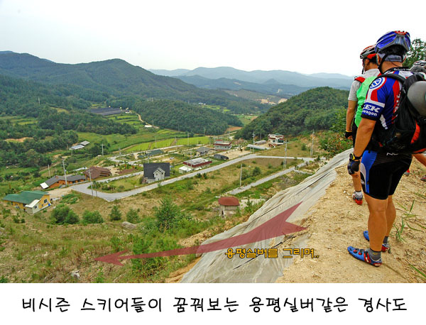 약 30Km까지 진행하면 아래로 시원한 매월부근 전경이 보이는 구간에 다다르게 된다. 최길성님은 스키인답게 아래로 펼쳐진 전경을 놓고 용평실버를 연상했다. 눈만 깔아놓으면 쏘고싶다는 그 간절함이 비시즌 스키어의 가슴을 쓸어내렸다. 그런 의미에서 풍광을 배경으로 기념사진 한장찍고..