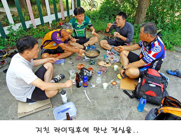 식사동안 내내 장사장님께서 장시간 라이딩후에 심신을 달래준다는 차디찬 맥주의 중요성을 역설하셨고 유혹에 못이겨 가게에서 준비한 맥주를 다들 두어잔씩 흔쾌히 들이키게 된다. 구름은 어드덧 걷히고 지글지글한 태양이 한낮에 위용을 더한다. 이로인해 곧 이어지는 후반코스 라이딩은 1/3은 알콜기운을 뽑아내는 처절한 때약볕 음주라이딩이 된다.