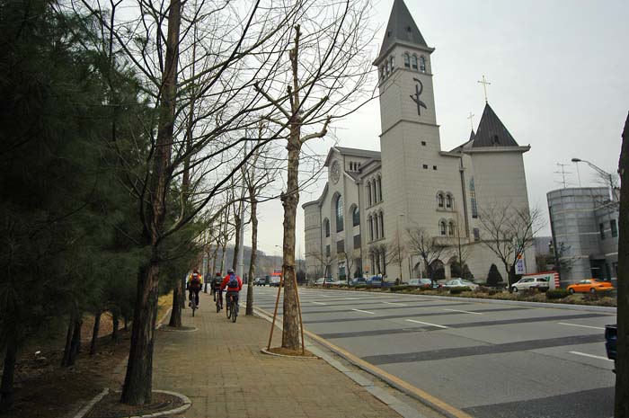 나를 포함한 4명의 라이더가 출발하여 태재고개 방향으로 진행한다. 우측으로 분당요한 성당이 우뚝 솟아 있다. 왼쪽 인도를 타고 태재고개를 천천히 오른다.