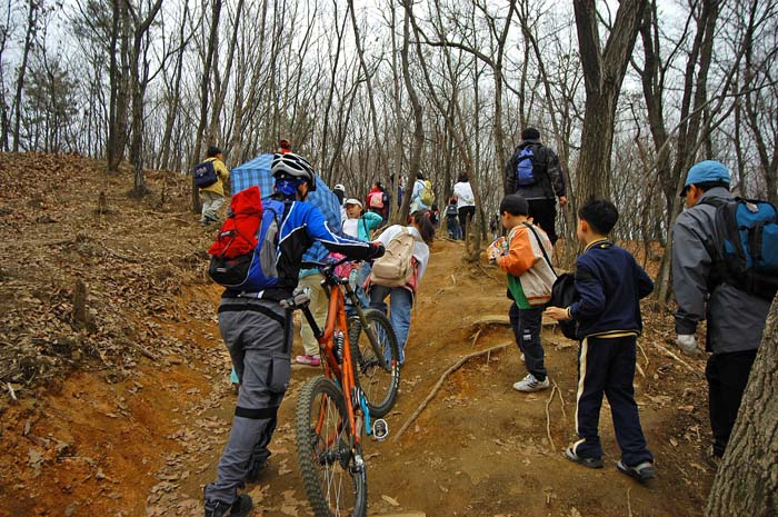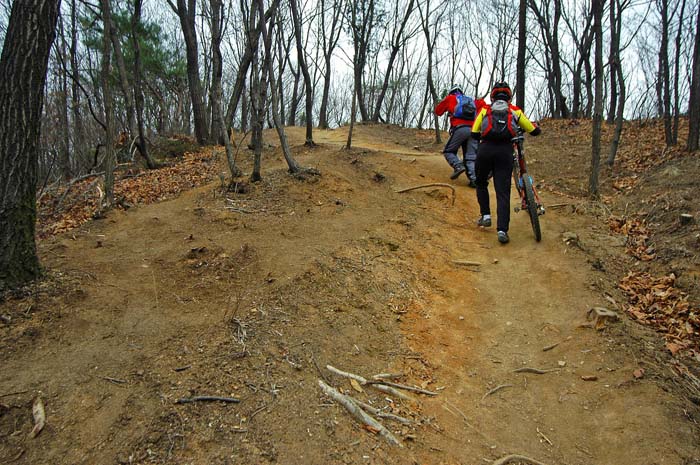 일행은 본의아니게 타고 끌고 한다. 평상시같으면 그냥 타고 올라갈길을 막무가내 초딩녀석들을 피해 다녀야 했다. 다행히 불곡산 직전에 선두를 추월해 갈 수 있었다. 길의 난이도는 불곡산을 오르는 길과 크게 다르지는 않았으나 능선지역이라 그런지 타고 갈 수 있는 곳이 많았다.