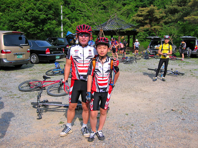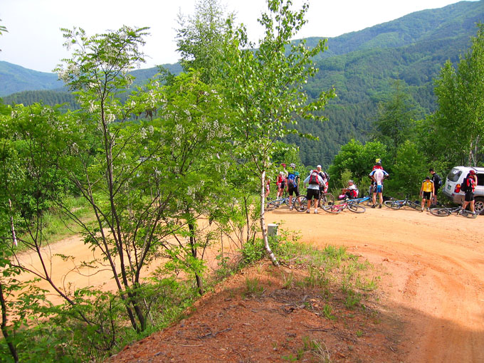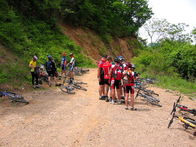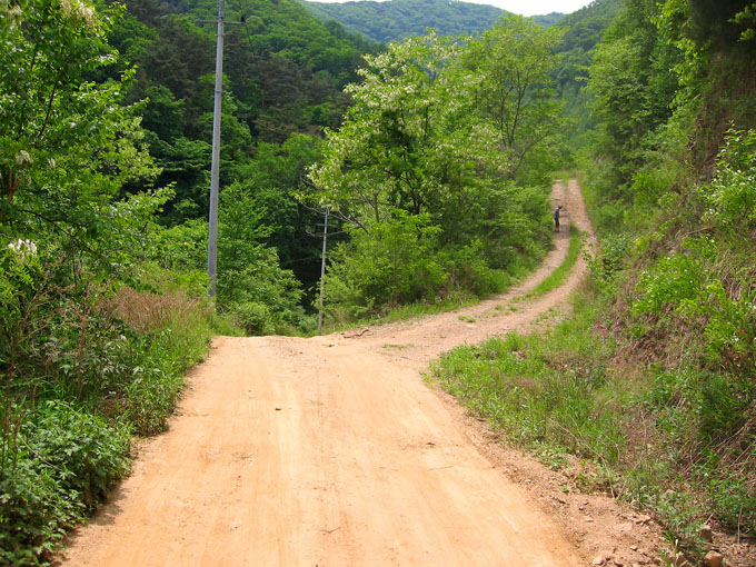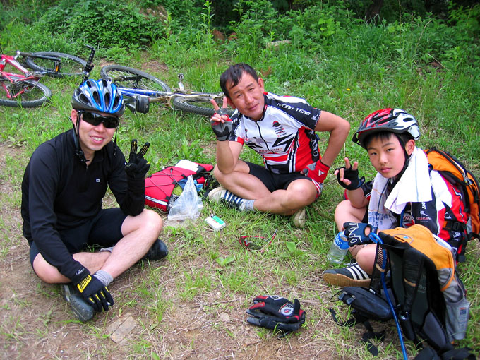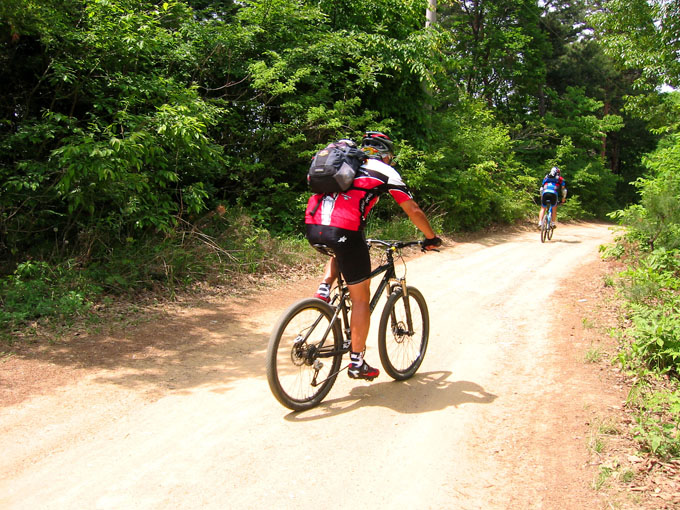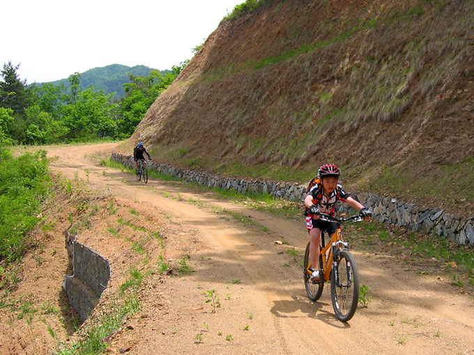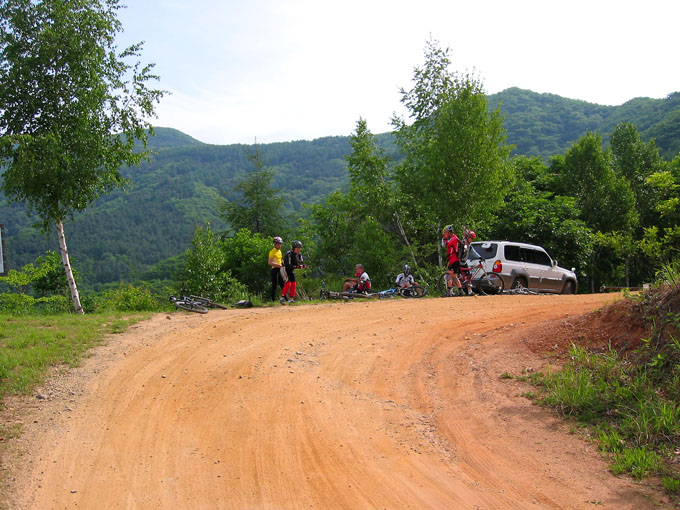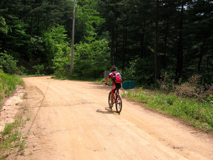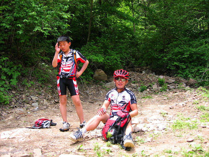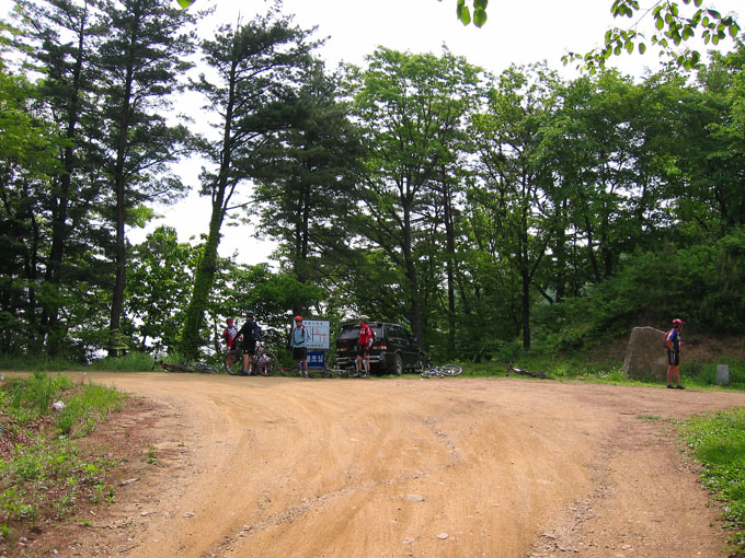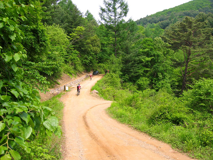5C에서 잠시 쉬려는데 어김없이 갈림길 아래에서 우렁찬 봉고차 소리가 들리고 이내 일행앞을 먼지를 휘날리며 지나간다. 휴~~ 오늘 라이딩내내 차량과의 전쟁은 이렇게 계속된다. 이제 조금 기나긴 업힐이 기다리고 있다. 물론 3Km정도 되는 업힐이지만 성현이에게는 기나긴 업힐 되겠다. 왜냐면 성현이가 상당히 지쳐 있기 때문이다. 유진복선생님과 내가 옆에서 토닥이면서 계속 가보지만 지칠대로 지친 성현이에게는 도움이 되지 않는다.