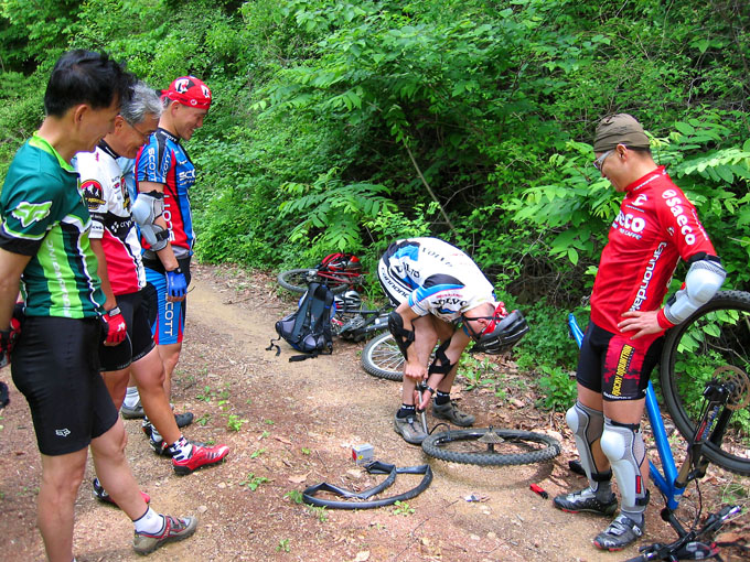 선두조의 배상범님 타이어가 펑크나 4, 5학년생 선배분들의 배려아래 열심히 타이어패치를 하고 있었다.
