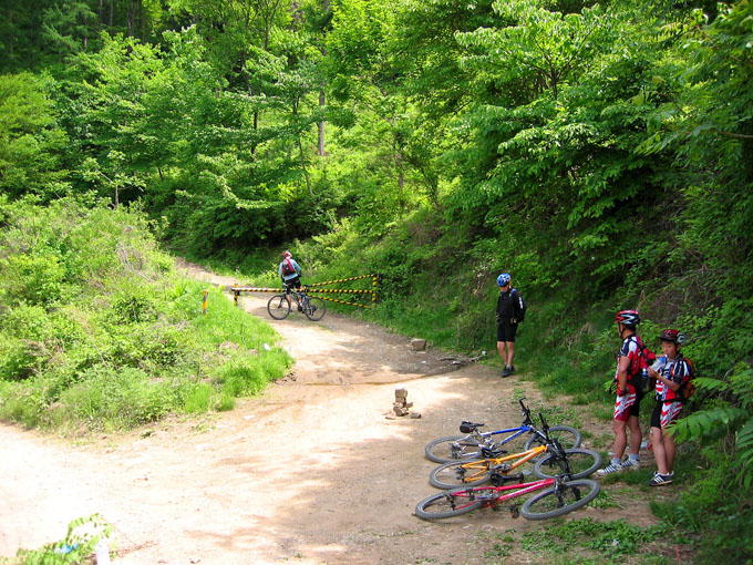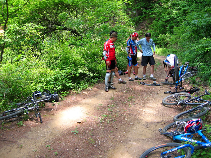 9C로 마지막 업힐을 시작한다.. 사실 9C까지도 딴힐을 예상했는데 8C부터 9C는 2Km가량의 바윗돌에다 돌덩어리 업힐 코스다. 내가 판단 착오를 한것이다. 노면상태도 좋지 않았다. 작년에는 그저 열심히 즐겁게 다녔던 길이지만 오늘은 후미조를 이끌고 올라야 하기에 근심이 앞선다. 일단 먼저 열심히 올라가 있다가 기다리기로 한다. 거의 9C근방에 왔을때 뒤에서 랑호가 애타게 부르는 소리가 들린다. 유선생님이 8C에서 못올라오고 계신단다. 잔차 행어엔드도 휘고 아까 자빠링 휴유증이 크다고 한다.. 이런.. 큰일났다는 생각이 든다.. 올랐던 길을 무지막지하게 딴힐하여 8C에 도달하니 유선생님이 주저앉아 있다. 잔차 엔드를 바로잡고 상태를 물으니 자빠링으로 인해 잠시 쇼크를 먹으신듯 하다.. 난 무심하게도 혼자 올라가벼렸으니.. 쯧ㅠㅠ