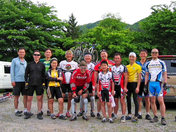 출발전 깔끔한 모습으로 기념사진 한장 담았다. (왼쪽부터 김랑호, 이봉우교장님과 유성현, 이종화박사님, 강명성님, 김영무소장님, 정이석님(뒤)과 이건찬님(앞), 배상범님, 김택수님, 공천규님.. 아쉽게도 유진복선생님이 빠져 있다.. 라이딩후 맨마지막 기념사진에 있으니 걱정마시라..^^)