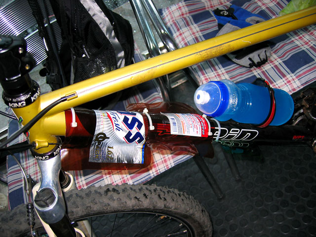 또한 잔차휀더의 역할이 절실해 진다. 휀더없는 우중라이딩의 고통을 익히 경험하신 분들은 이미 알고 계시리라. 진흙이 똥꼬에 무수히 축적되고 얼굴, 눈 입을 가리지 않고 튀어오르는 흙들의 향연을..^^ 오늘 손선생님이 이변호님의 사전코치에 힘입어 맥주플라스틱 병을 이용한 즉석휀더를 만드셨다. 생존을 위한 필사적인 아이디어 되겠다.^^ 고난 극복은 발명의 어머니라는 옛말이 생각난다.. 그런말이 있었나?