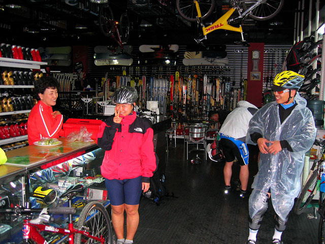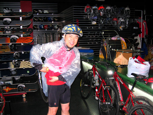 손선생님과 함께 알샵에 이르니 남부군이 이슈님만 빼고 모두 출근부에 도장을 찍으셨다. 오광택님 인솔하에 강석희님과 박성준님이 와계셨다. 오늘의 깜짝 게스트 하일랜드 전성득사장님도 오셨다. 전사장님은 비올줄은 몰랐다고 하시는데 오늘 라이딩에 흔쾌히 참석하시겠단다. ^^ 우비에 퍼머용 비닐두건이 잘 어울리신다. 참고로 빨간 져지는 여성용이라고 하신다.^^