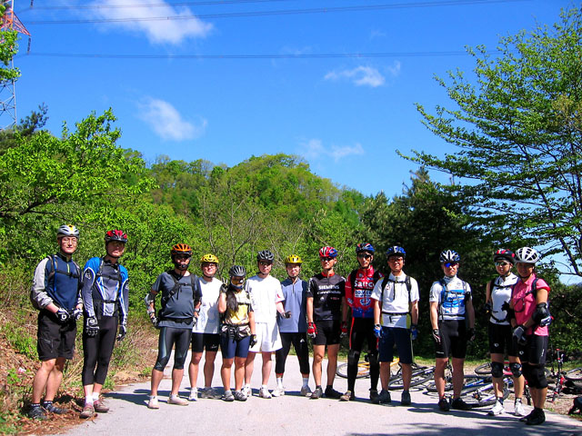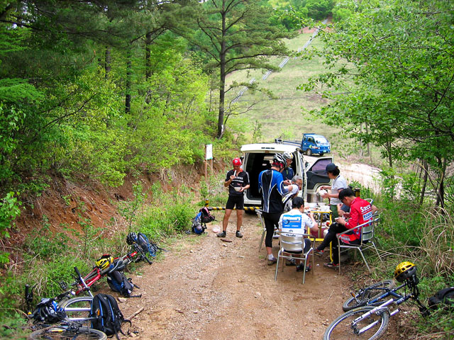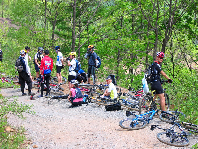 장용석님 부부와 심은지님은 개인적인 사정으로 알샵차와 함께 서울로 향한다. 나머지 일행은 클린턴코스의 하이라이트 식후 껄떡업힐에 도전한다. 껄떡업힐 직전 식수를 보충하는 곳이다. 사전에 업힐에 대한 과장된 예고로 학생분들 내심 긴장하고 계신 듯 하다.^^