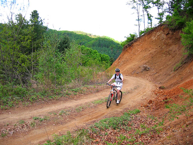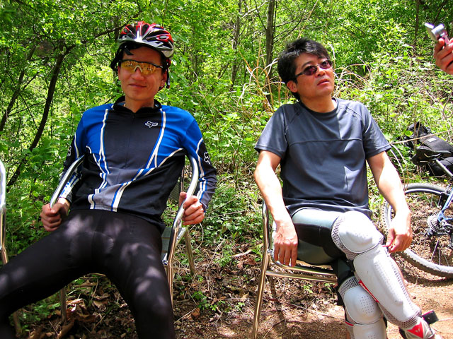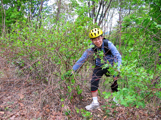 그 와중에 철저한 생활력으로 무장한 김택수님을 사진에 담는다. 뒤에 달린 봉지에는 두릅이 한가득이다. 나중 라이딩말미에는 저 봉지가 더 빵빵해지게 된다. 저번주에 두릅따러 오신분들께 돈주고 산 두릅맛에 매료된 탓이다. 오늘 날을 제대로 잡은 분중에 하나다. 다음주에 두릅에 관심있으신 분들은 이분의 라이딩복장을 벤치마킹하시기 바란다. 추가 정보로 두릅딸때 장갑은 두꺼운 가죽장갑이나 이중 면장갑이 좋다. 두릅가시가 만만치 않아서 이다.